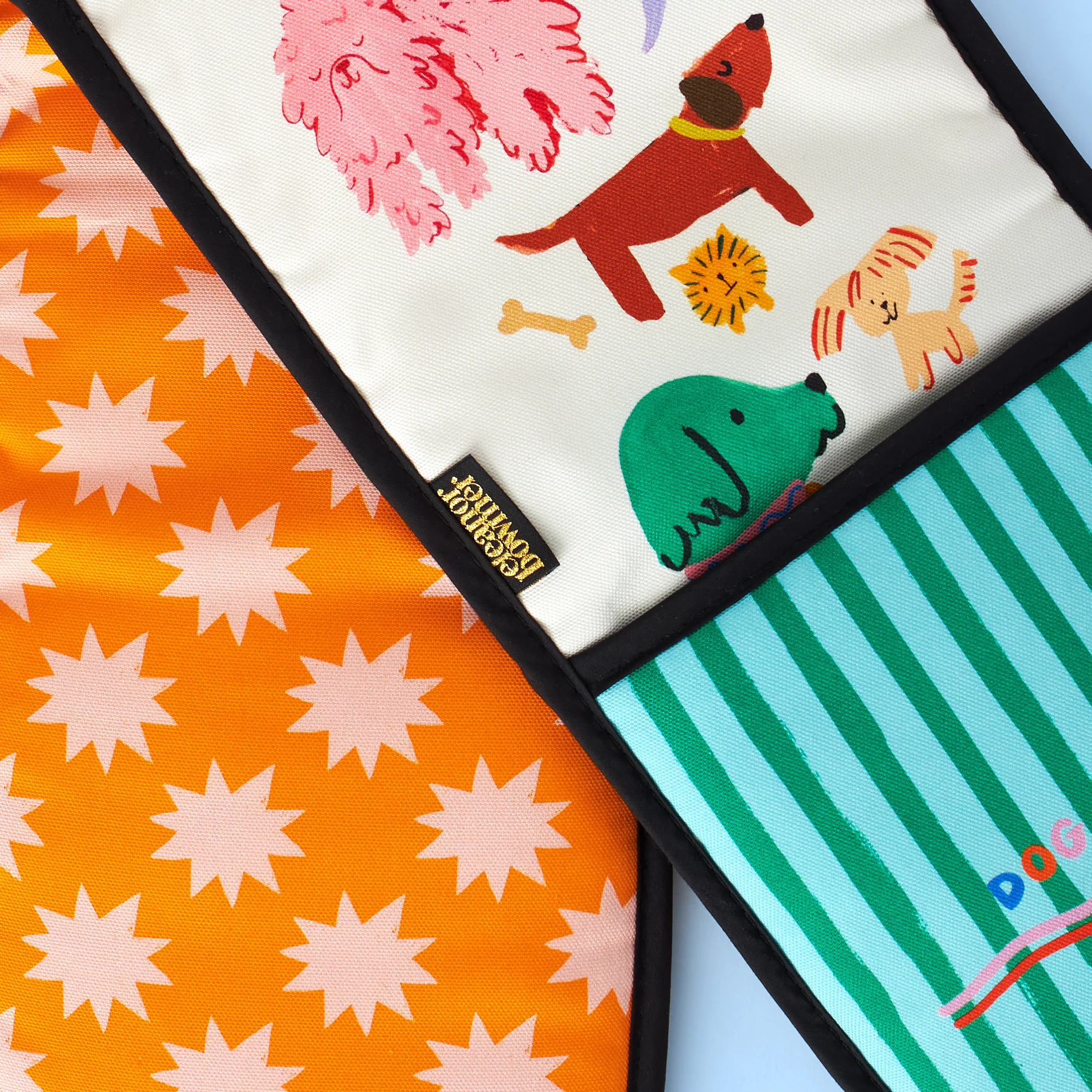 Keep your paws protected while cooking with our Dog Club Oven Glove. These cream gloves feature adorable illustrated dogs and a vibrant pink and orange star design on the reverse. With our striped hand covers and "dog club" message, you can show off your love for dogs while keeping your hands safe. Complete the look with our matching apron and tote bag.