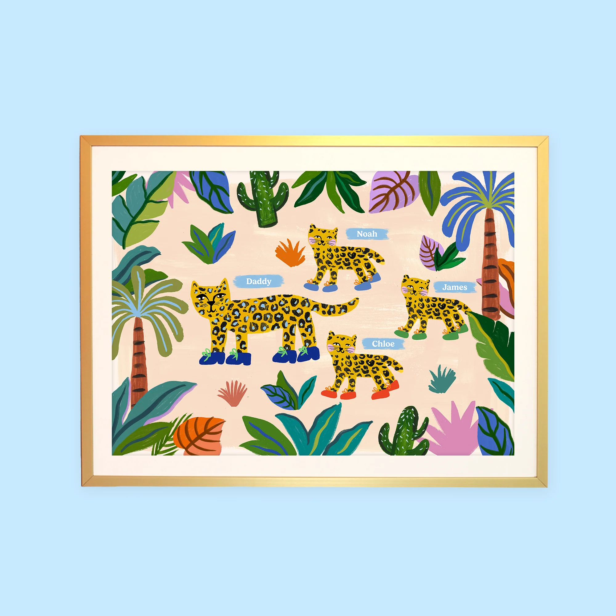 This print makes a wonderful present for mums and dads on special occasions. Set against a blush pink background, the palms print gives it a tropical feel and features a cute leopard family which can be personalised to match your own lovely family.Â