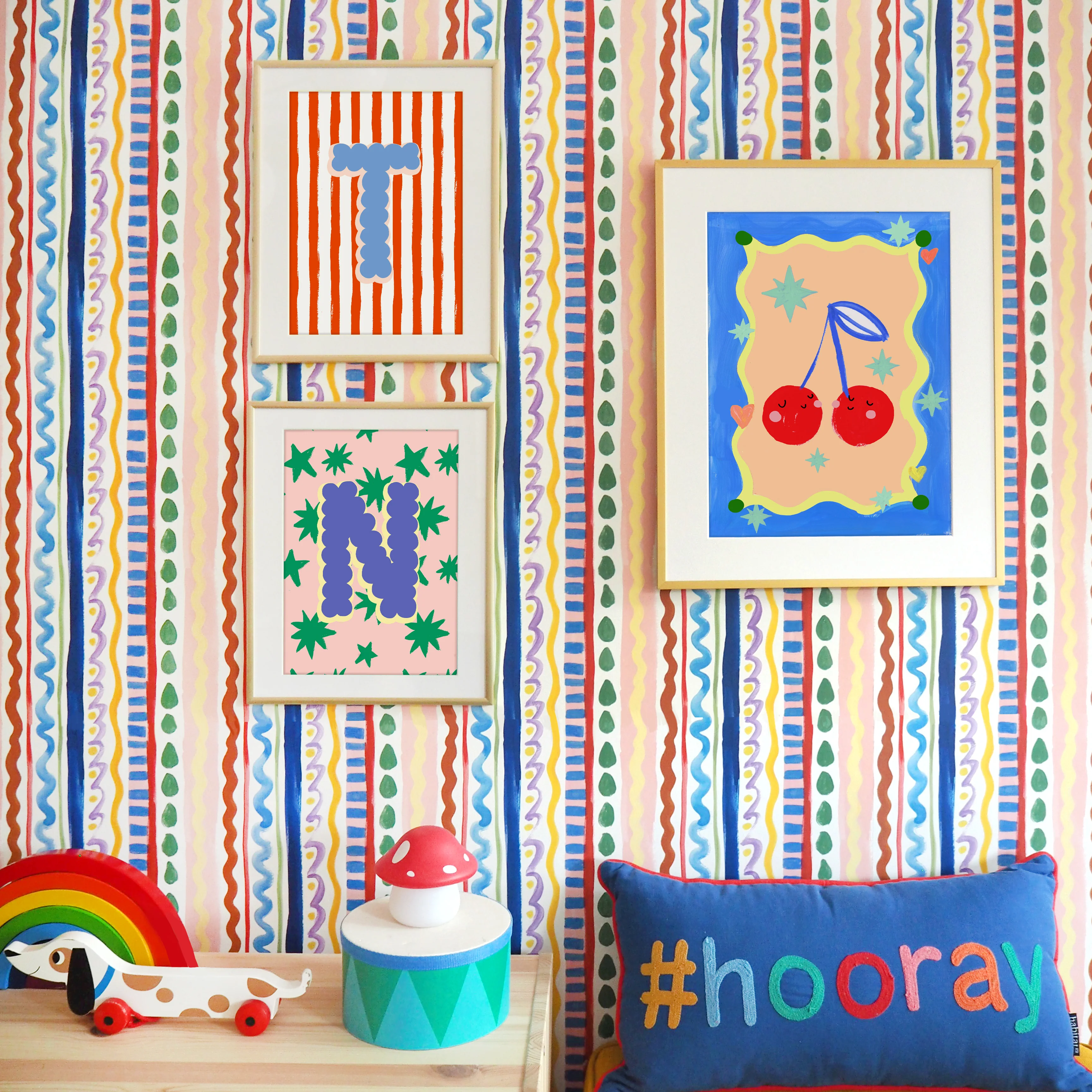 Our Red Stripe Scallop Initial Print features a central initial that can be personalised over a red and white stripe background.