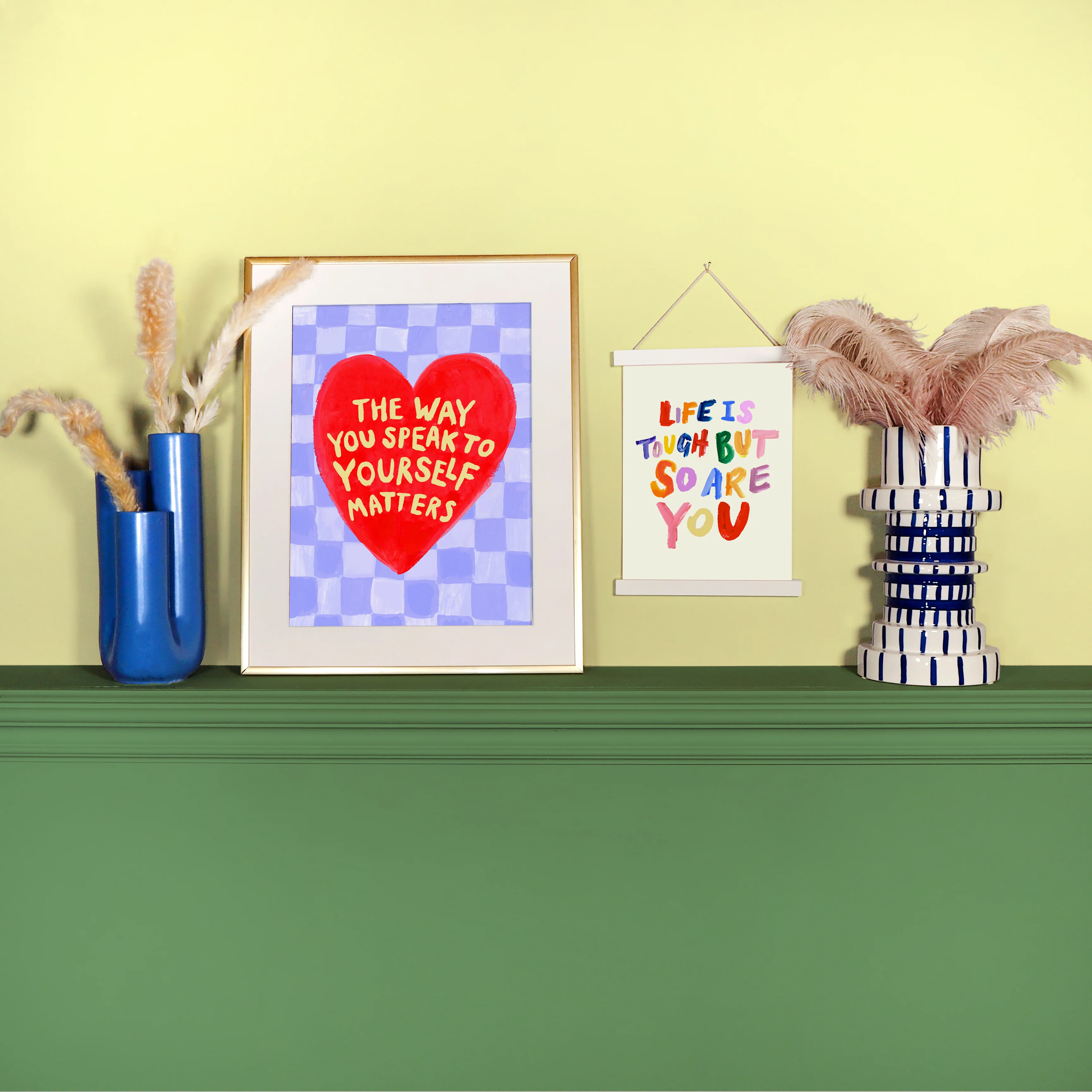 Our 'The Way You Speak To Yourself' print features hand painted typography over a lilac checkerboard background. This print would sit perfectly with our 'Ride The Wave' and 'Just Peachy' prints.