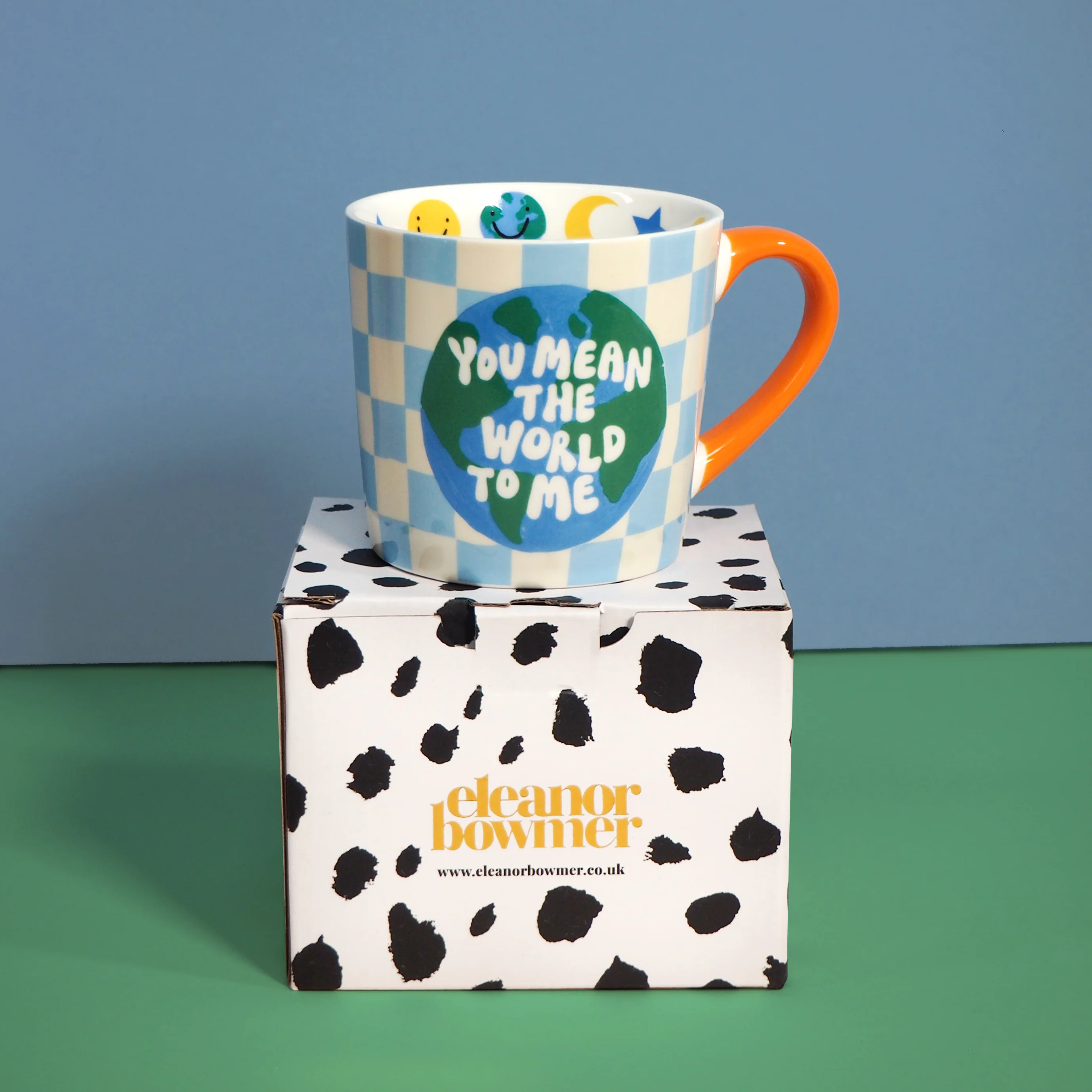 You know that favourite mug you have in your cupboard, well move it over as this could be your new favourite! Featuring a sky blue checkerboard pattern and colour pop orange handle, the mug has an illustrated world with the message 'You mean the world to me' across it.